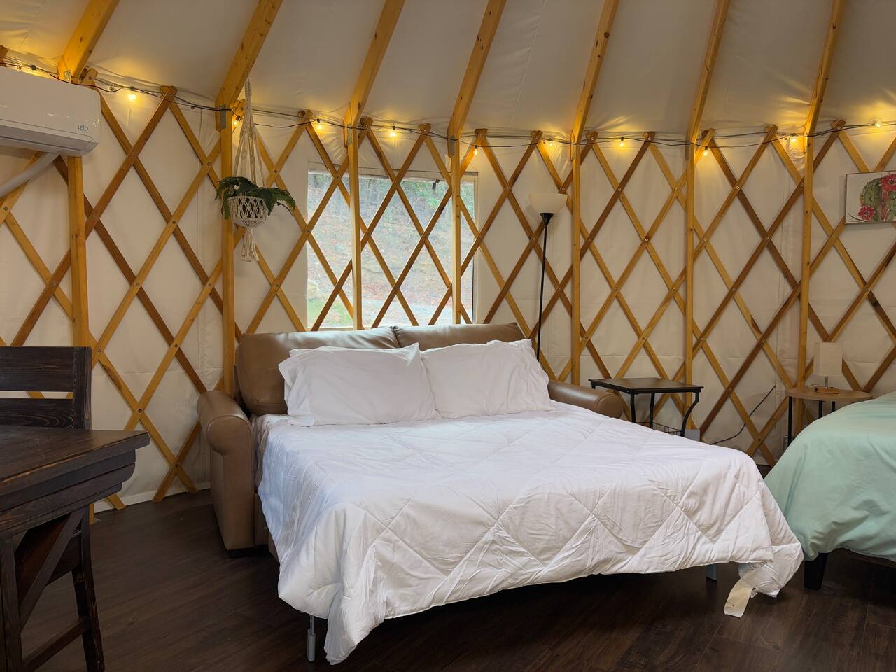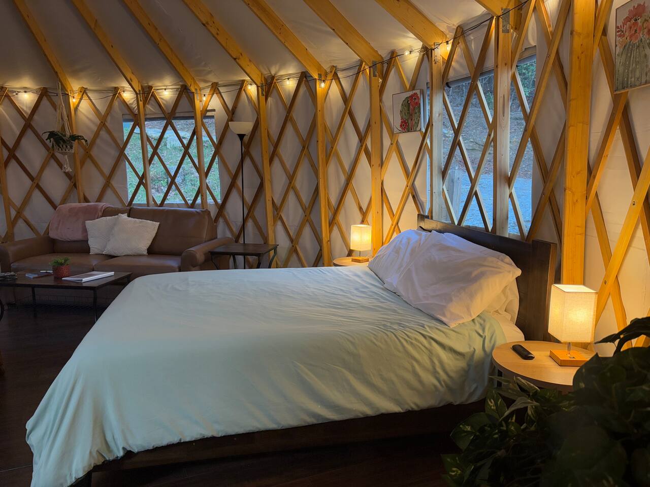 Nestled in the heart of Nantahala, the Pala Chino Yurt is the perfect place to relax and reconnect with nature. Enjoy stunning forest views, watersports on Lake Nanatahala, take a hike on Bartram Trail, have a coffee from your private deck, or curl up by the fire with a good book. Our yurt is fully equipped with everything you need for a comfortable stay, including a kitchenette, full-size bathroom and shower, queen-size bed, and a queen-size sleeper sofa. Whether you're looking for a romantic getaway, attending a wedding nearby, or enjoying a family vacation, our yurt is the perfect place to create lasting memories. The half-acre property has plenty of parking and turnaround space (up to three vehicles allowed), a 10 foot picnic table, large fire pit, and private outdoor deck space. Vehicles with low ground clearance and motorcycles are not recommended, as the road and driveway up the hill are gravel. Trailers are prohibited. Inside, you’ll find a queen-size bed that sleeps two people as well as a queen-size sleeper sofa that sleeps two people. The kitchenette is equipped with an apartment-style fridge and freezer, induction burner cooktop, microwave, coffee pot, and other small standard kitchen appliances. Amenities: • Large, private deck with chairs • Picnic table • Fire pit and chairs • Parking for up to 3 vehicles (no trailers allowed, four-wheel drive vehicles recommended) • Kitchenette with small refrigerator and freezer, induction cooktop, microwave, and more • Full-sized bathroom with stand-in shower and toilet • A/C and heat • Queen-size bed (sleeps 2) • Queen-size sleeper sofa (sleeps 2) *Please book for 3-4 guests so we may leave sheets for the sleeper sofa* • Linens and towels provided • Pool towels can also be provided, please message the host to request • WiFi • TV • Pet-friendly (no pet beds, bowls, or toys provided) IMPORTANT INFORMATION ABOUT THE AREA There will be NO CELL PHONE RECEPTION at the yurt and within a 10-15 mile radius of the property. Guests are encouraged to use our WiFi and turn on WiFi calling (check with your cell carrier to see if this is provided). For routing your phone maps to the yurt, please route when you leave your current location (while you still have cell service). YOU WILL LOSE SERVICE WHEN YOU’RE ABOUT 10-15 MILES AWAY. If you keep your cell phone maps routed and DON'T TOUCH IT, it will still keep your route up to the property. Specific directions and yurt location will be provided after booking. Please message us for other specific questions about the area, amenities, or availability! We look forward to hosting you in Nantahala!